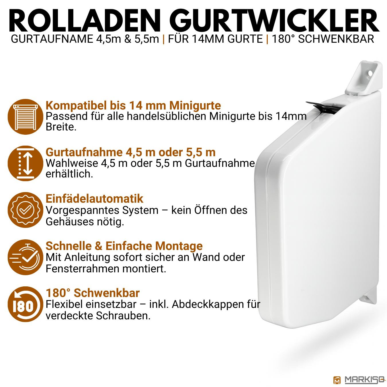 Je nach Rollladenhöhe wählen Sie zwischen 4,5 m oder 5,5 m Gurtaufnahme. So bleibt der Gurt sauber aufgewickelt und der Wickler arbeitet zuverlässig.