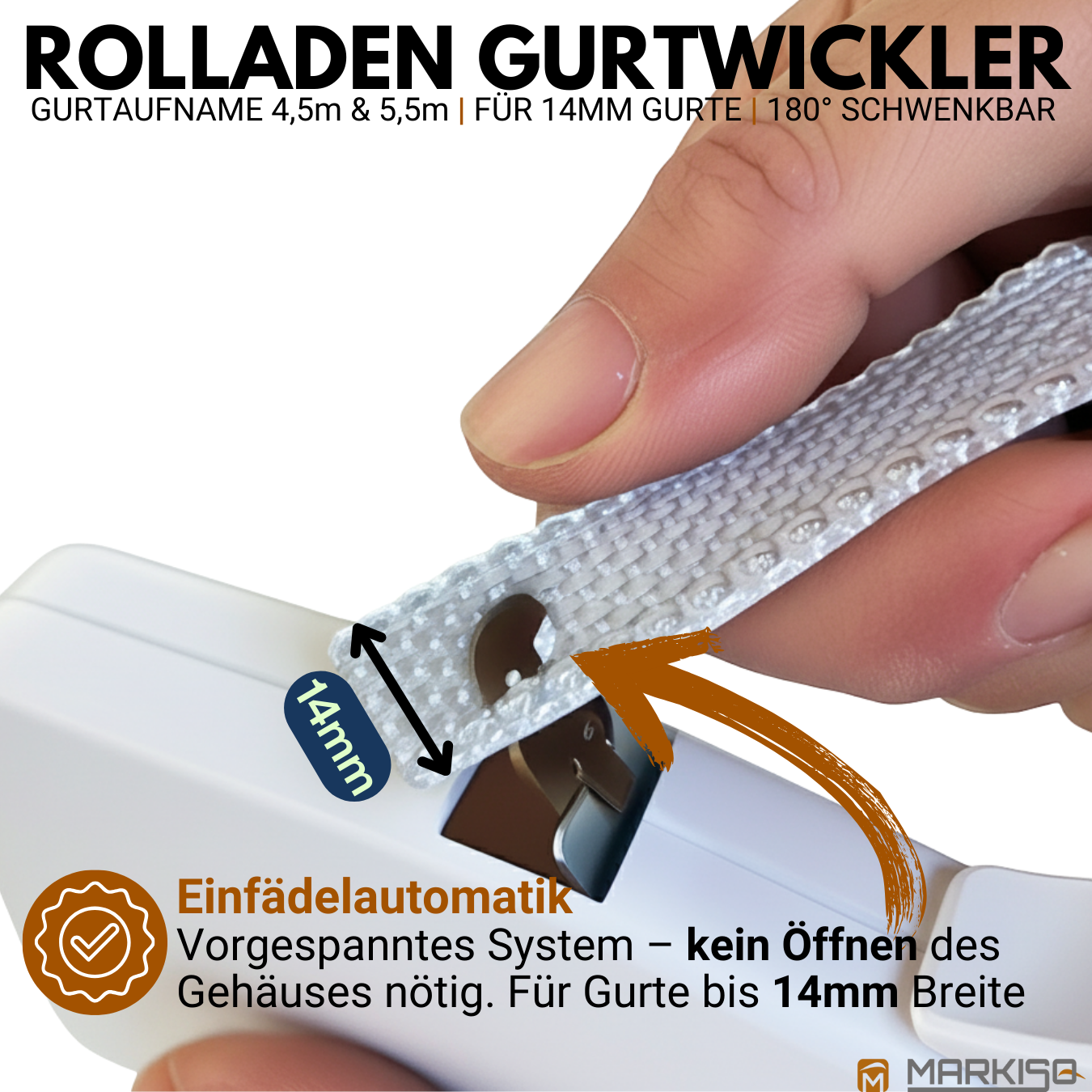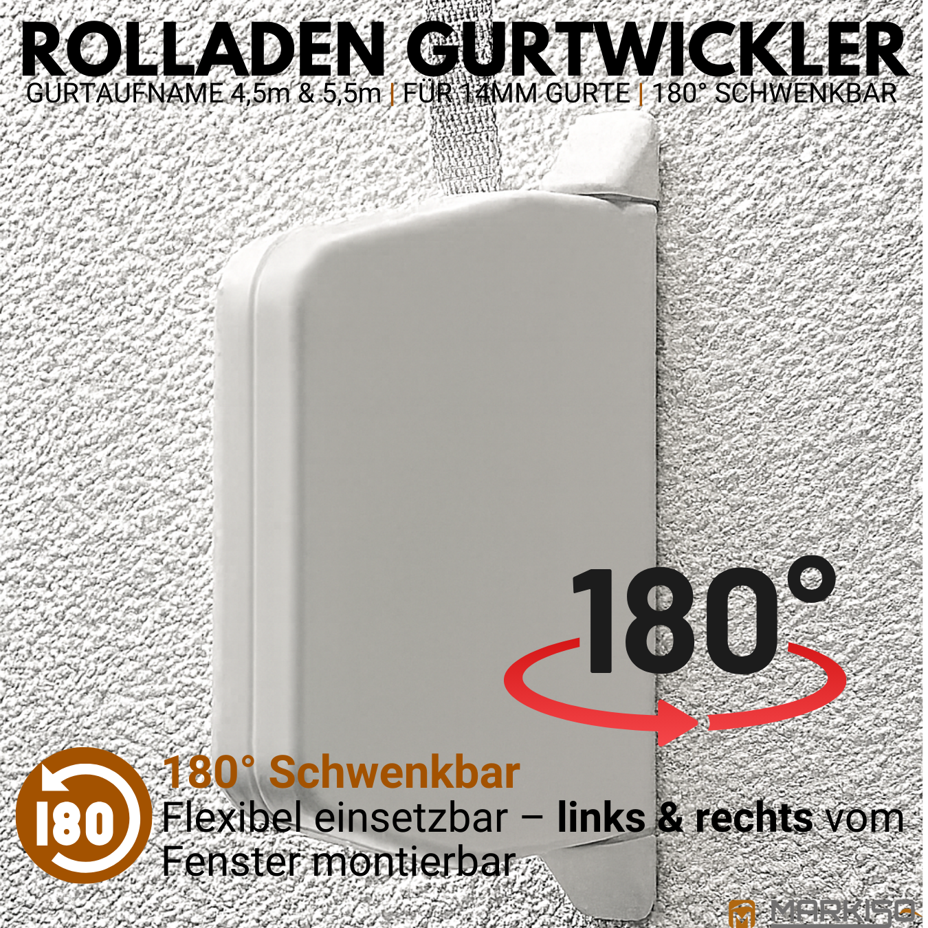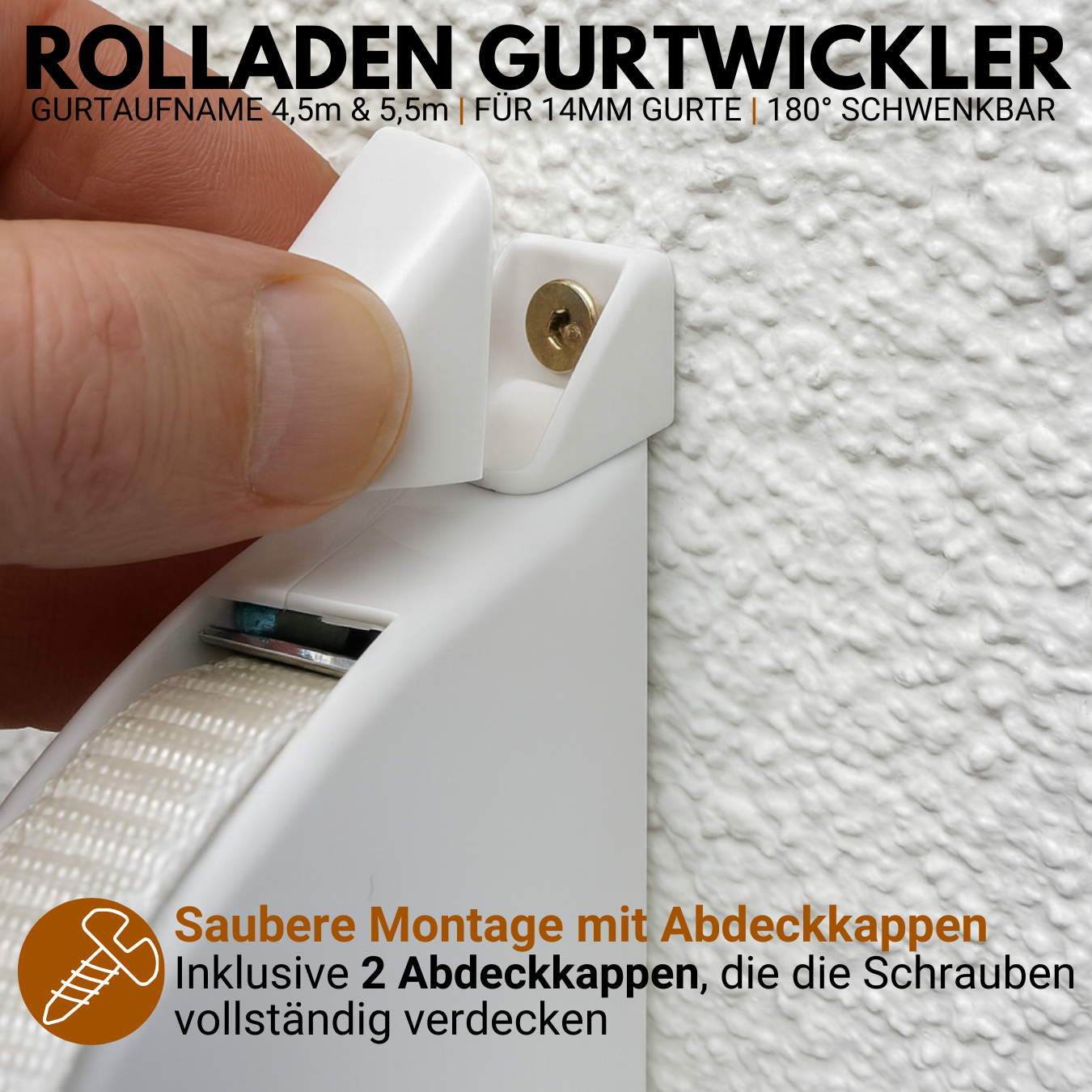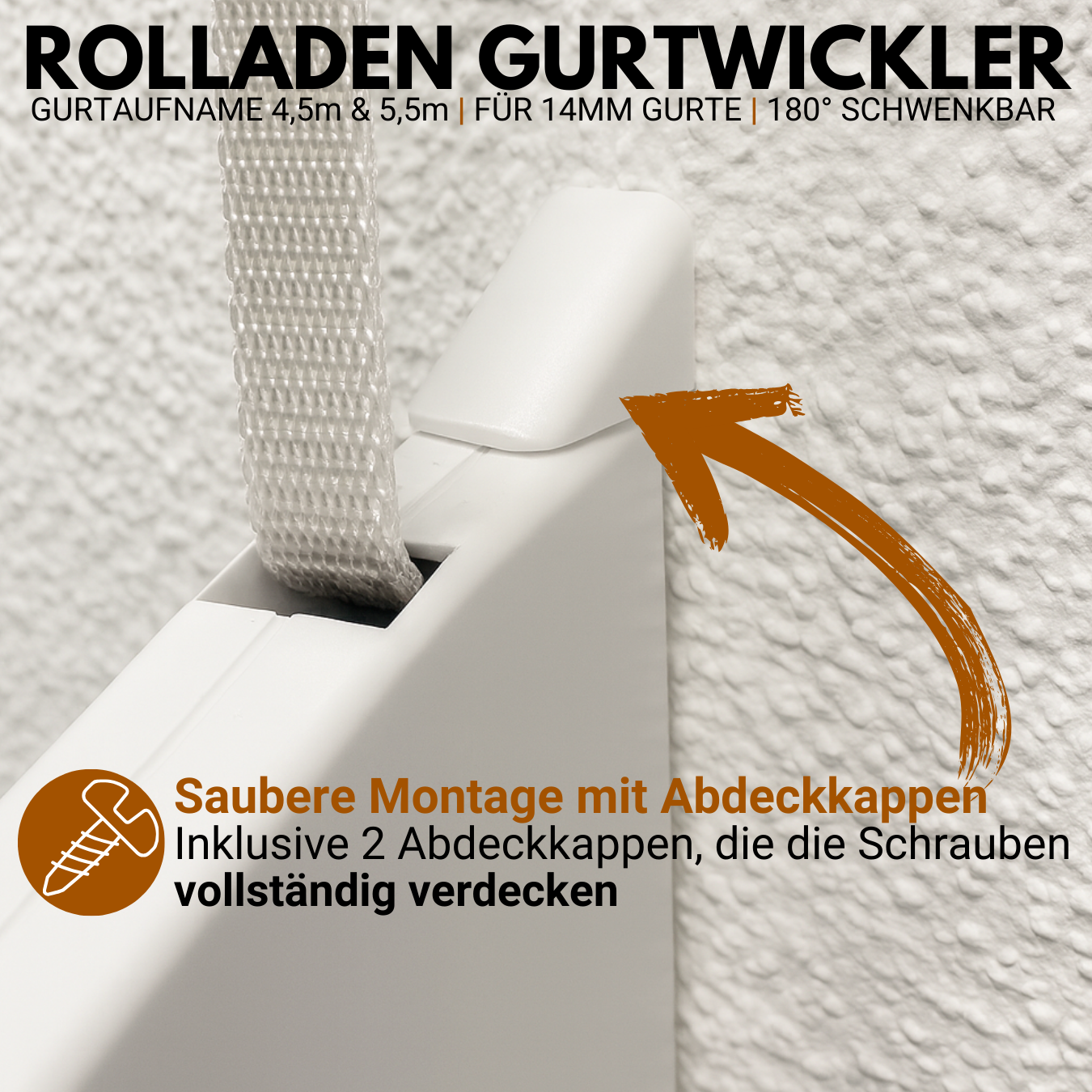 Mit Gurtaufnahme 4,5 m oder 5,5 m, Einfädelautomatik, 180° Schwenkbarkeit und inklusive Abdeckkappen bietet dieser Wickler alles, was ein modernes Rollladensystem braucht – ideal für Austausch, Renovierung oder Neubau.