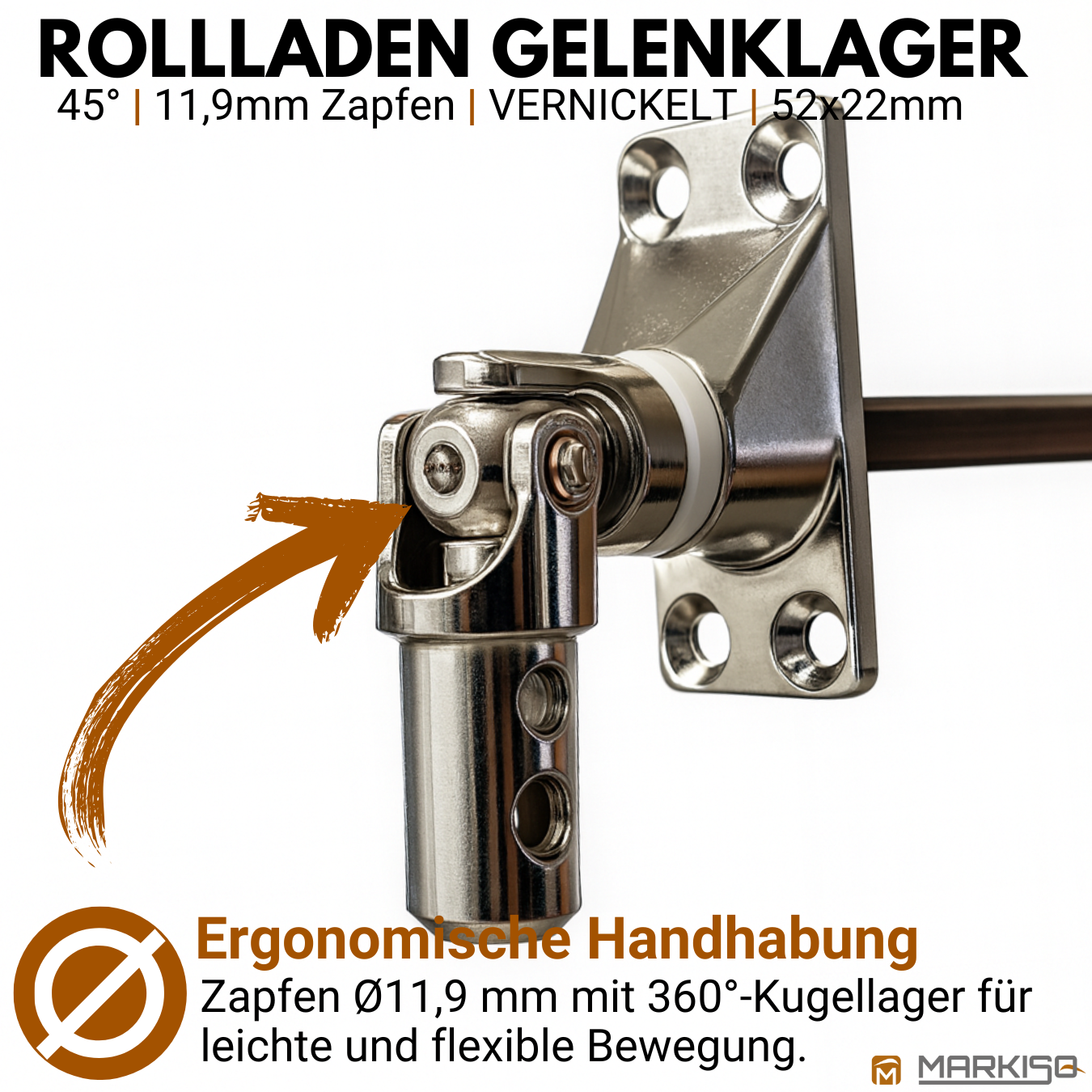 Unser Rolladengelenklager 45° besteht aus hochwertig vernickeltem Material, das zuverlässig vor Korrosion schützt und eine lange Lebensdauer garantiert. Der 45°-Winkel sorgt für eine optimale Kraftübertragung und eine ruhige Bedienung des Rollladens.