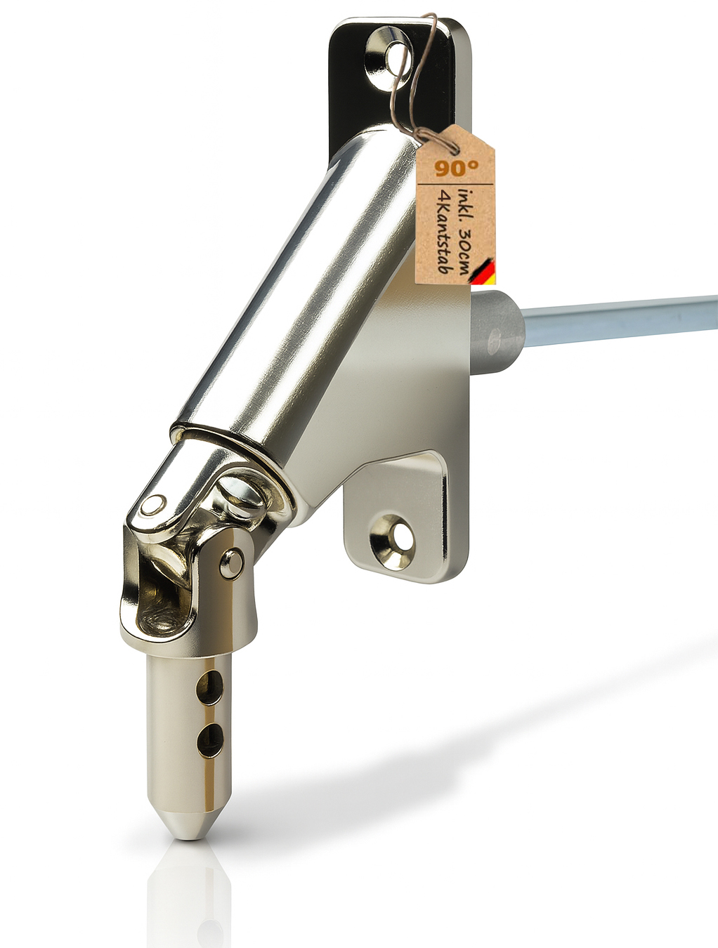 - Stift : 4Kant oder 6 Kant (bitte auswählen) 6mm / 300 mm (Lange kürzbar) Platte aus vernickeltem oder pulverbeschichtetem Zinkdruckguß. Gelenklager aus vernickeltem oder pulverbeschichtetem Zinkdruckguß.