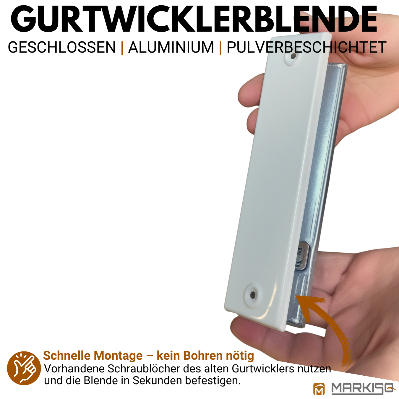 Mit der Rolladengurt-Abwickler Blende komplett geschlossen schließen Sie sauber und elegant die Öffnung des ehemaligen Gurtwicklers, nachdem Sie auf einen elektrischen Rollladenantrieb umgerüstet haben. Die hochwertige Aluminiumblende sorgt für eine nahtlose, moderne Optik und schützt gleichzeitig vor Staub und Schmutz.
