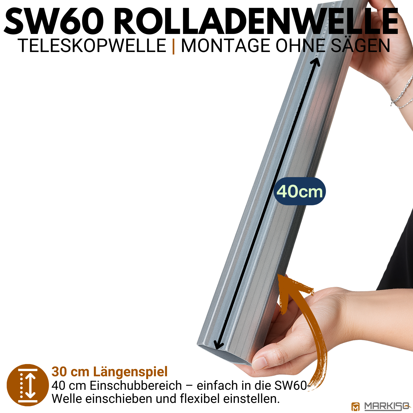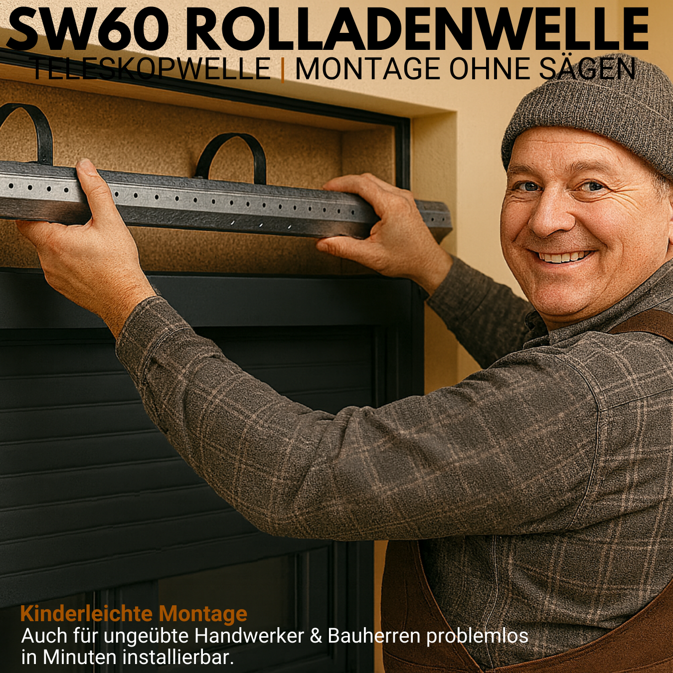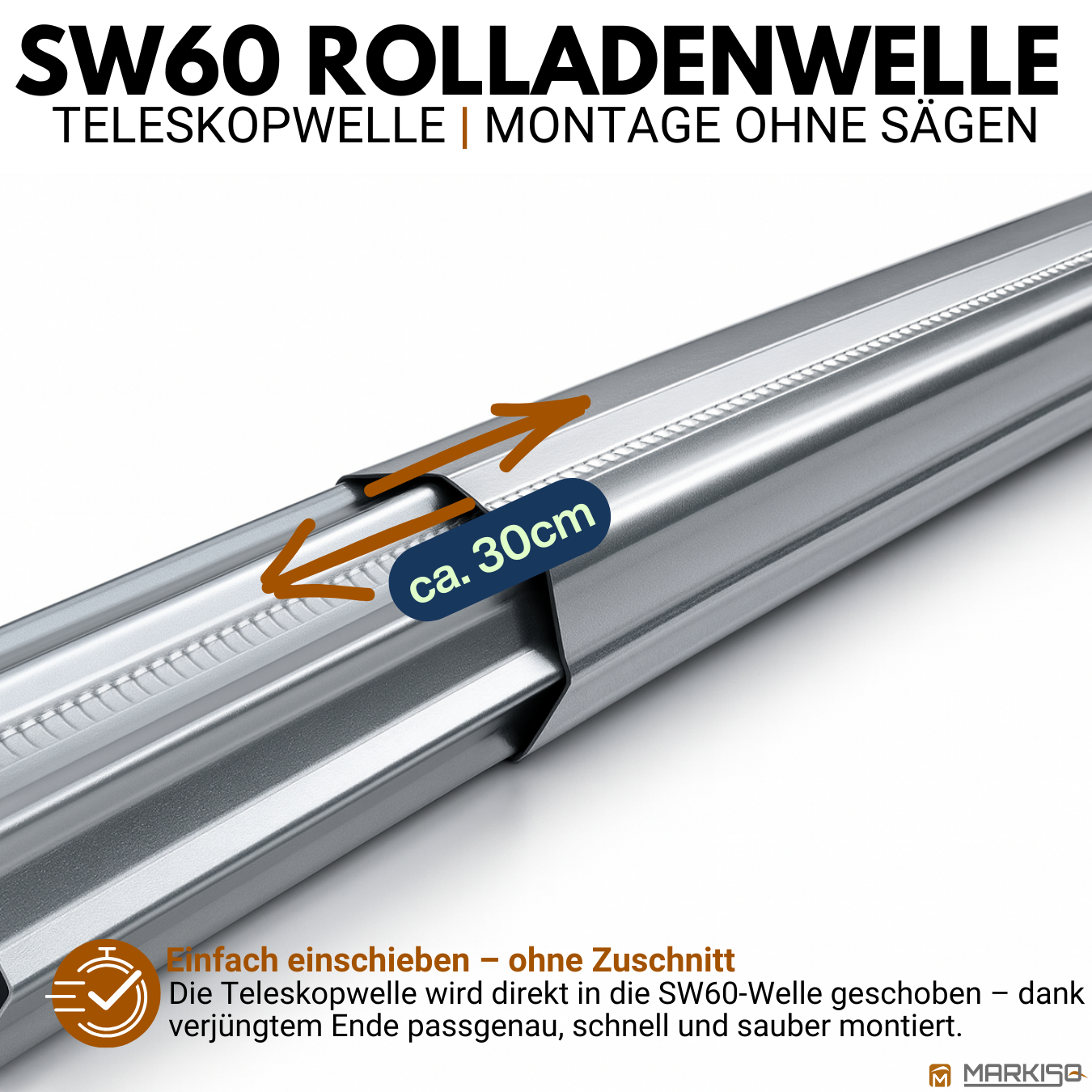 Die Rollladenwelle SW60 mit integrierter Teleskopwelle ist die ideale Lösung für alle, die eine passgenaue, robuste und werkzeugarme Rollladenmontage wünschen. Dank der stufenlos verstellbaren Teleskopfunktion entfällt das Zuschneiden – einfacher, schneller und präziser geht es kaum. Perfekt für Neubau, Sanierung und den Austausch bestehender Rollladenwellen.