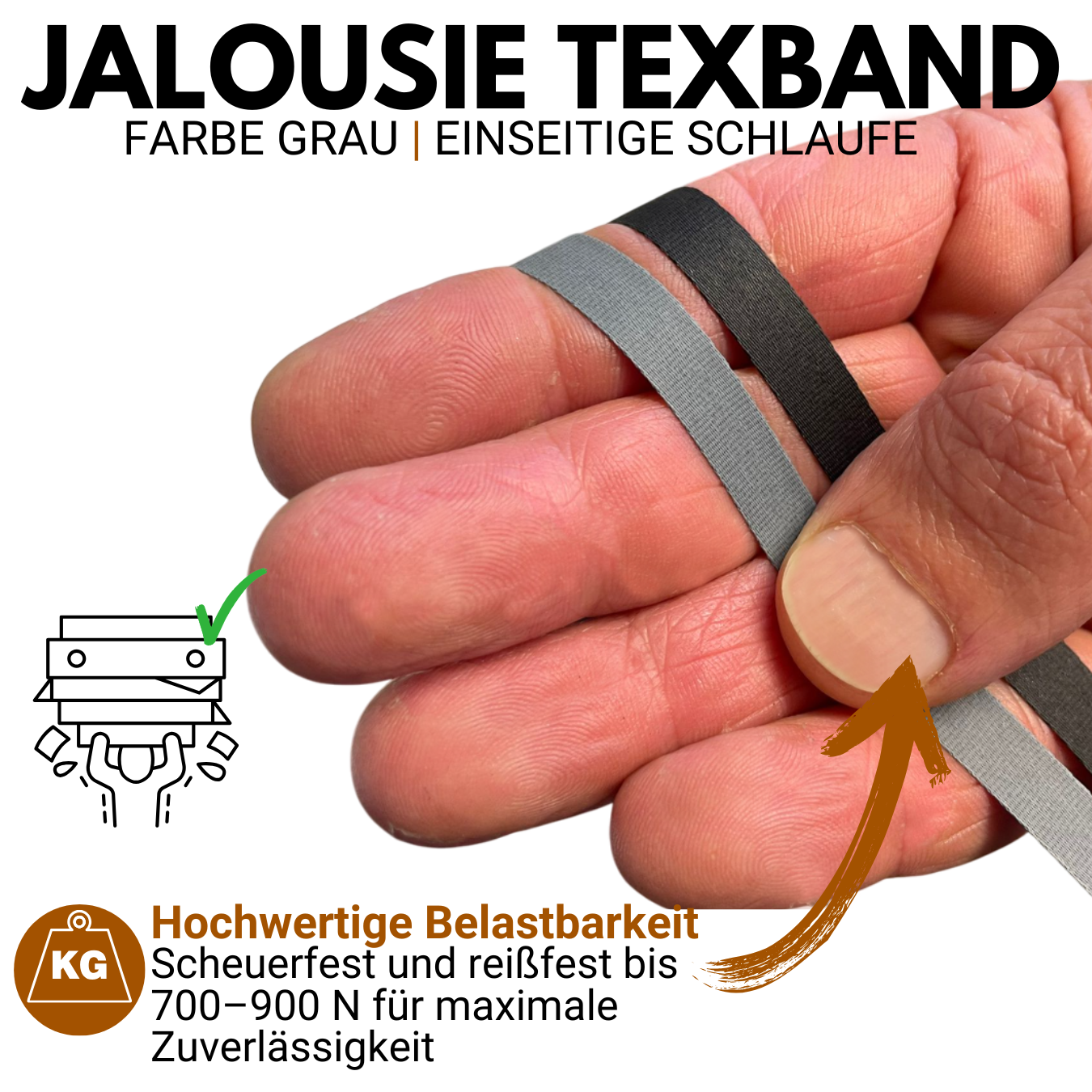 Ersetzen Sie schnell und einfach Ihr gerissenes Aufzugsband mit unserem hochwertigen Jalousie Texband 6x0,33 mm in Grau.